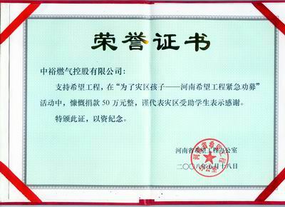 "隨著救援活動的進一步深入開展,汶川大地震所引發的慘重災情深深地觸動了每一位中裕人的靈魂。5月18日,中裕燃氣控股有限公司繼各子公司自發組織員工掀起以“奉獻一份愛心,貢獻一份力量”為主題的捐助災區熱潮之后,又于河南省希望工程辦公室發起的“為了災區孩子——河南希望工程緊急勸募”活動中再行義舉,捐出善款50萬元。